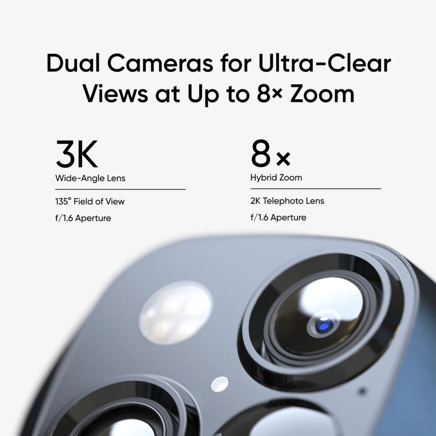 Ultra-Clear Dual-Camera View – 3K wide-angle lens + 2K telephoto lens, 8× hybrid zoom, up to 15m / 50 ft clarity