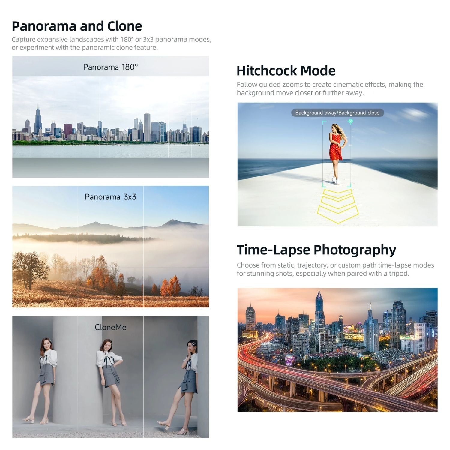 Shooting Modes: Inception, Crazy, Time-Lapse, Hitchcock, Panorama, Clone, LIFE mode