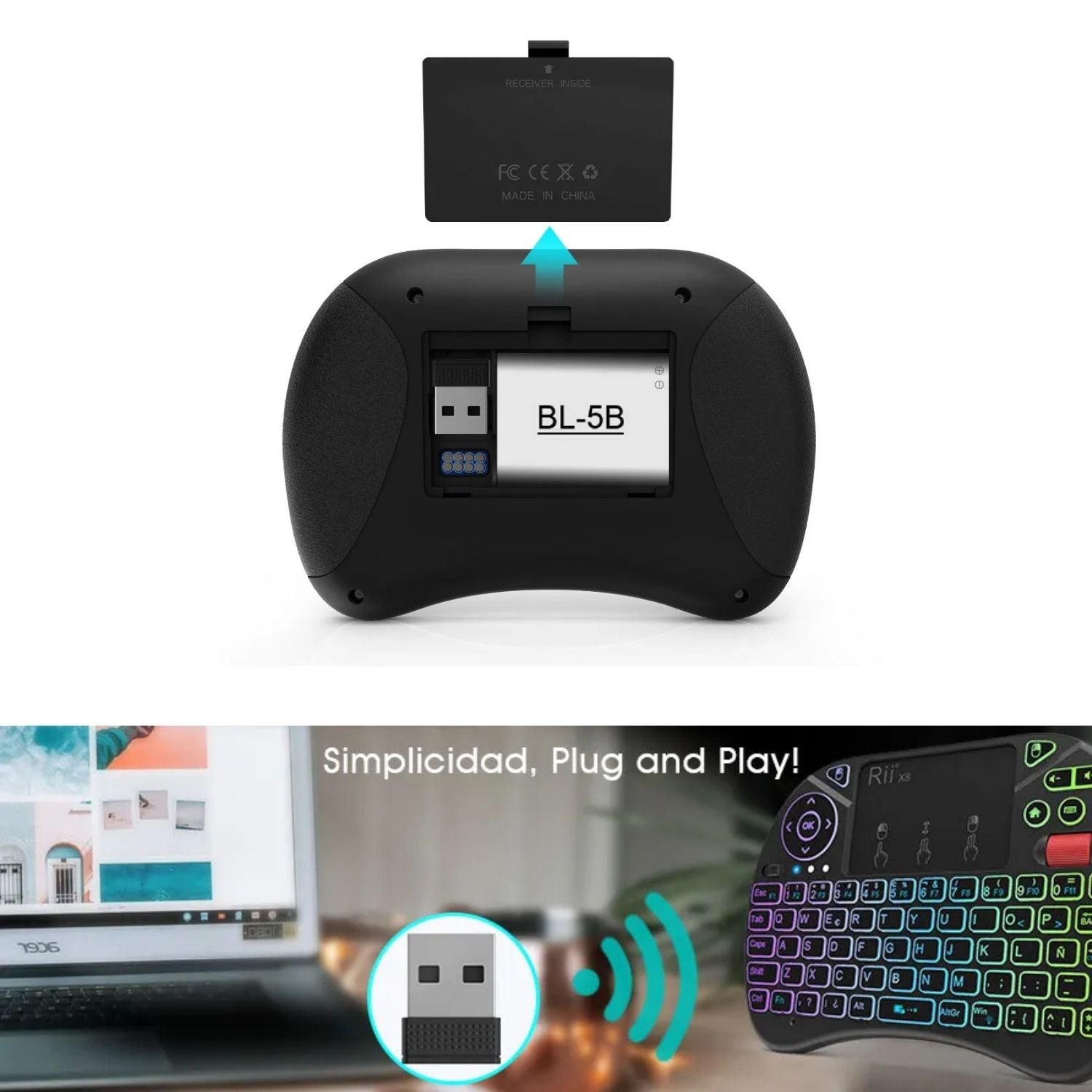 The Rii X8 is a compact 2.4GHz wireless mini keyboard with touchpad, backlit keys, and multimedia functions. Designed for seamless control of Android TV boxes, PCs, gaming consoles, and smart devices, it supports multiple languages (Russian, English, French, Spanish) and features intuitive touchpad gestures for easy navigation.
