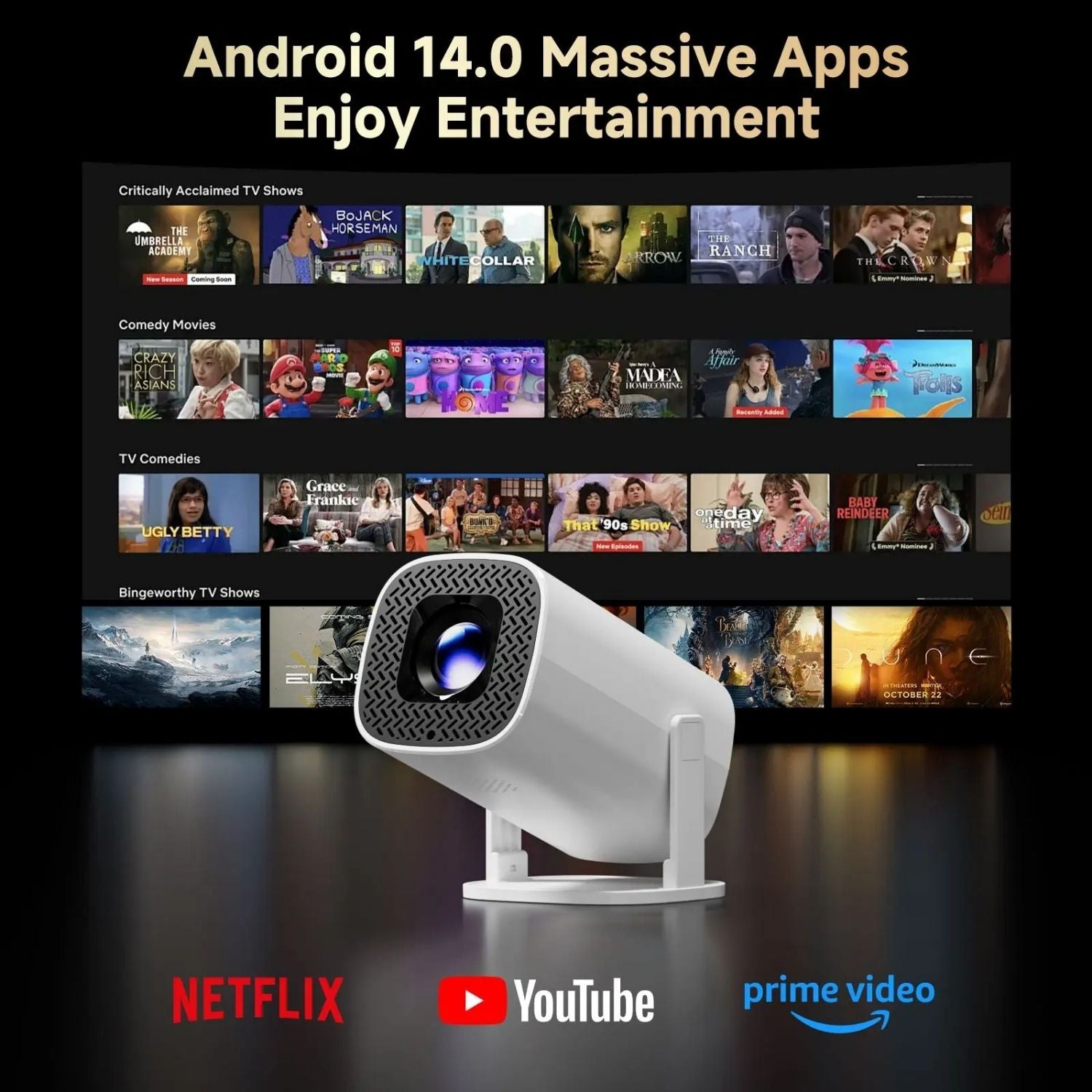 Bring the cinema experience anywhere with the Smart Mini Projector. Compact yet powerful, this projector delivers native 720P HD resolution with 4K input support, perfect for movies, gaming, or presentations. Running Android 14, it allows you to stream apps, play games, or multitask seamlessly. With WiFi6 and Bluetooth 5.4, you get fast, stable wireless connections for effortless streaming and device pairing.